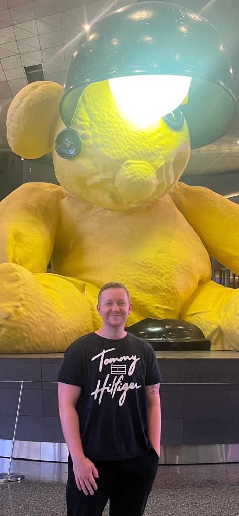 Perhaps the most famous of the artworks is the Lamp Bear which features prominently in a large foyer serving as a nexus between the terminals. The airport is so busy at all hours of day that it took me almost twenty minutes to find someone to snap my photo and for the background to clear of pedestrians, even at 3 am!