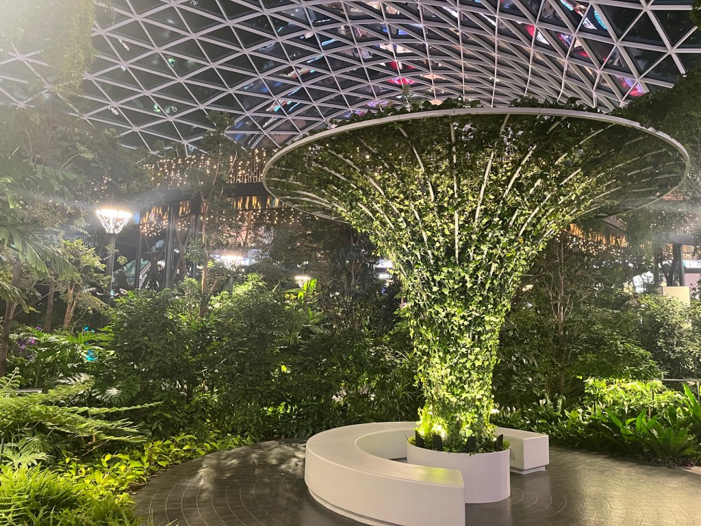Ohh the envy. Meandering through this beautiful indoor garden, I found multiple families asleep; sprawled across lawns, benches, and huts (whose construction and shape seem almost intentional for this purpose). Calming audio of birds chirping, insects clicking, and water flowing are injected into the orchard via speakers, elevating the peaceful and calm ambience. Even with all of the premium camp sites occupied, window shopping through the classy cafes, brand-name shops, and tempting restaurants surrounding the perimeter of the orchard was a great time kill. I even managed to pick up a few gifts for friends and family to deliver upon my return. I later learned this section of the airport only opened recently in 2022; which is perhaps why I hadn’t heard of this cool installation the way I’ve heard of Changi airport’s “The Jewel”. Which is another highly acclaimed airport I look forward to visiting.